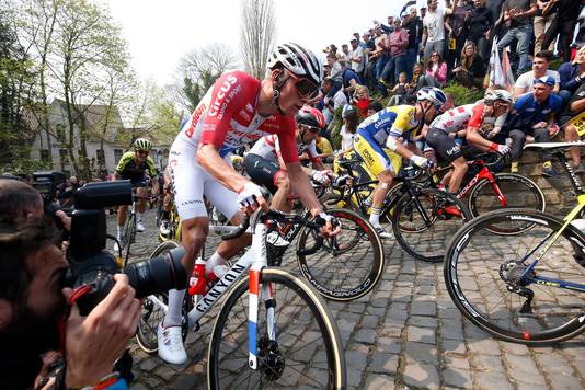 Van der poel reed tijdens de ronde van vlaanderen van 2019 voor het eerst met zijn witte broek.